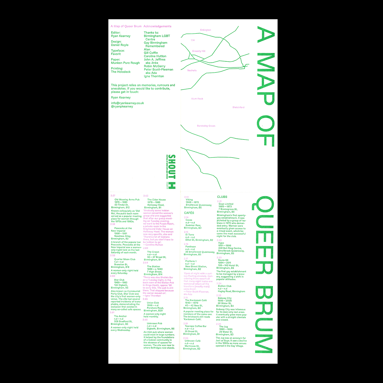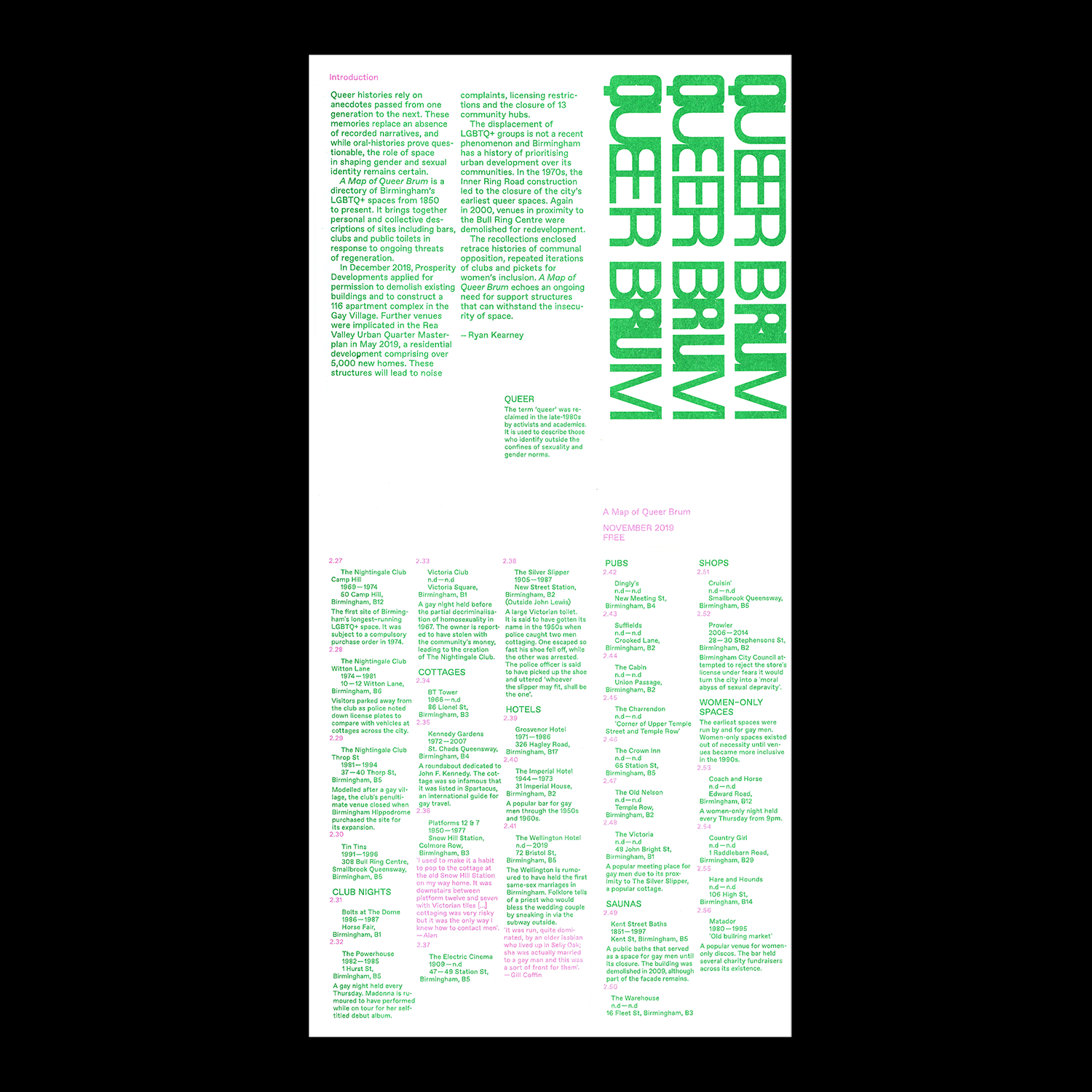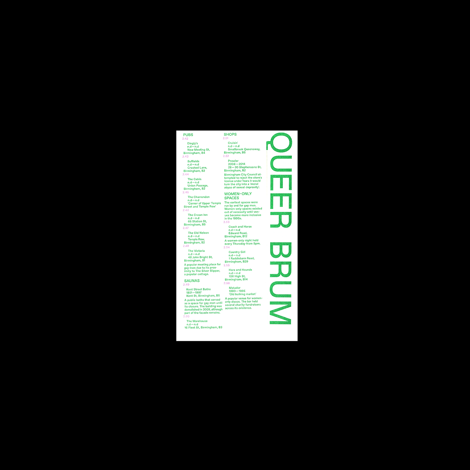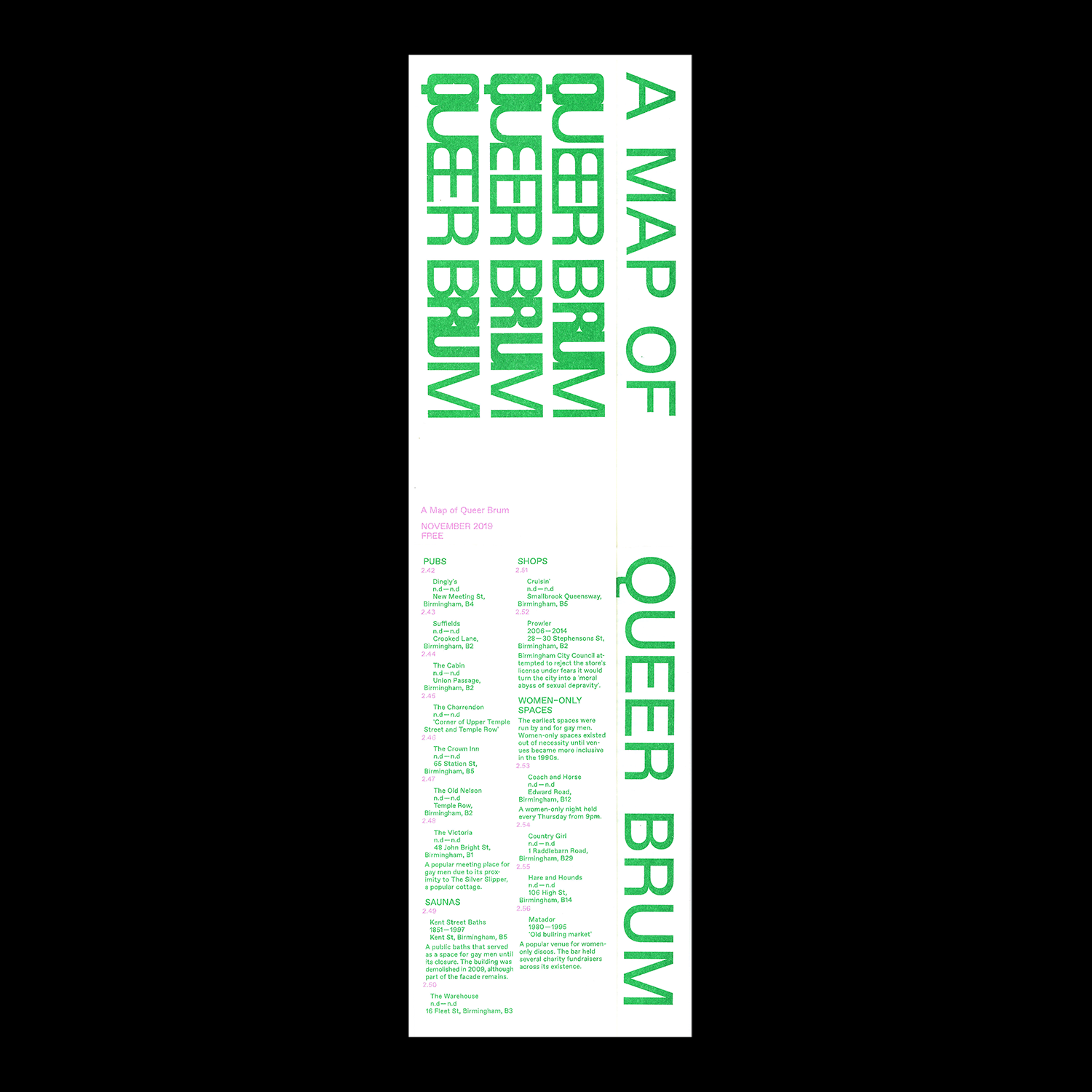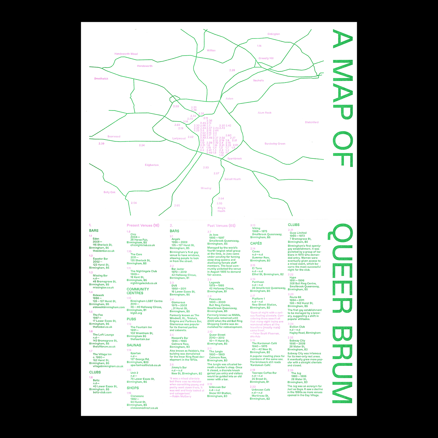 A Map of Queer Brum is a directory of Birmingham’s LGBTQ+ spaces from 1850 to present. It brings together personal and collective descriptions of sites including bars, clubs and public toilets in response to ongoing threats of regeneration.